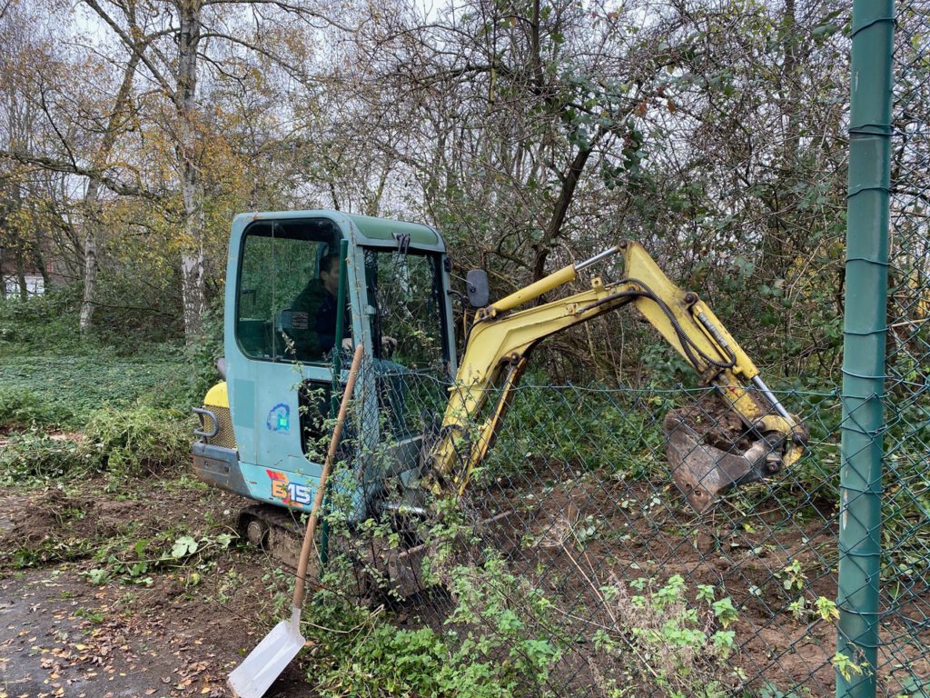 Unsere Umbauarbeiten sind schon im vollem Gang und nachdem die alte marode Ballwand bei der Herbstaktion schon entfernt wurde, sind wir nun dabei, das Gelände zu bearbeiten.